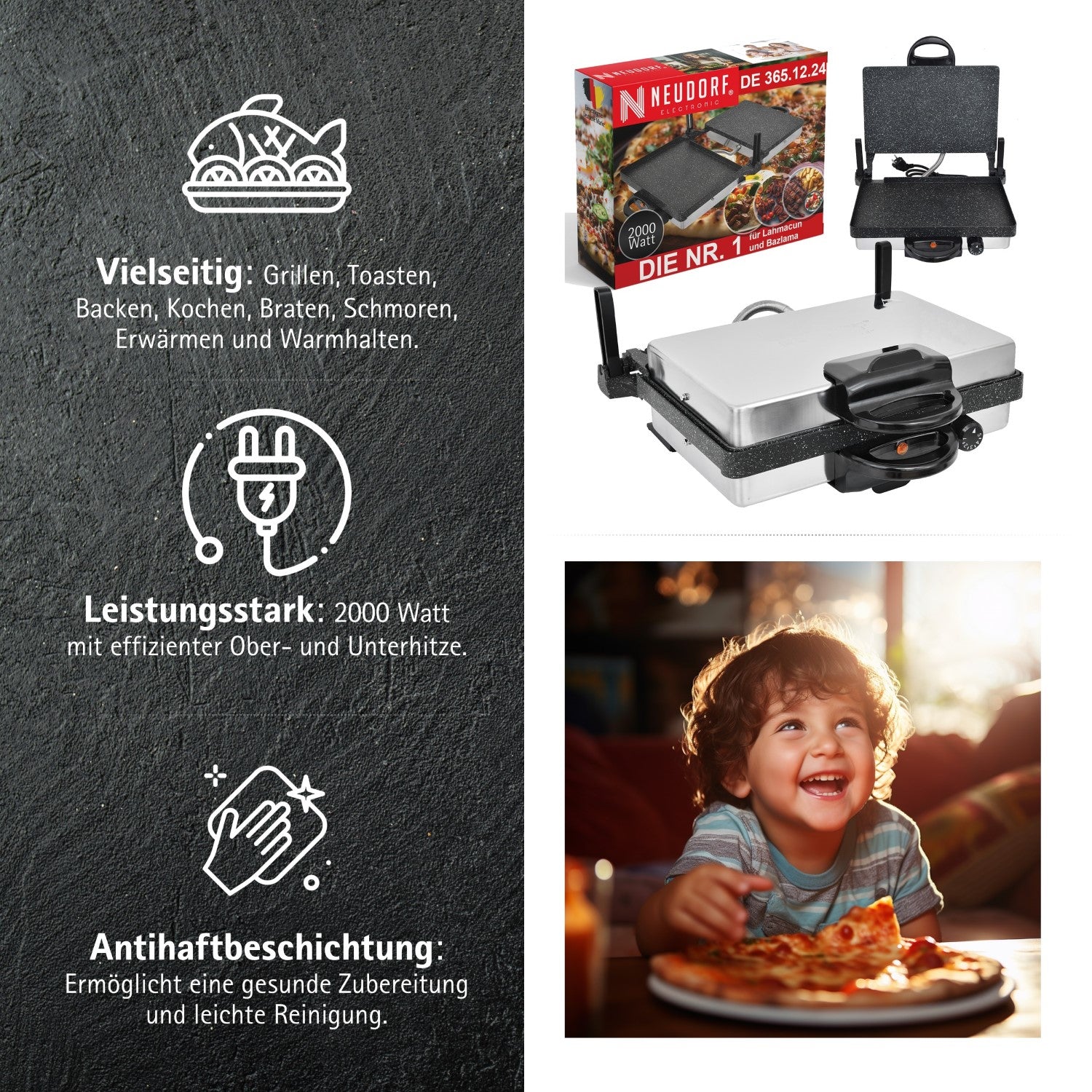 Entdecken Sie das Neudorf Lahmacun Makinesi Multigrill-Set mit Kasserolle – die perfekte Kombination für vielseitiges Kochen, Grillen und Backen in Ihrer Küche. Dieses Set vereint Verfügbarkeit für Abholungen konnte nicht geladen werden Sie können Ihre Bestellung innerhalb von 14 Tagen ohne Angabe von Gründen widerrufen. Weitere Informationen finden Sie in unserer Widerrufsbelehrung und den AGB. Der Neudorf Lahmacun Makinesi Multigrill 2000W vereint gleich mehrere Küchengeräte in einem. Ob als Kontaktgrill, Toaster oder Lahmacun-Maschine – mit seiner starken Leistung und den großzügigen Grillplatten gelingen Ihnen vielfältige Gerichte im Handumdrehen. Ihre Vorteile: Mit dem Multigrill sind Ihrer Kreativität keine Grenzen gesetzt. Ob orientalisch, mediterran oder klassisch – hier einige Ideen für Ihre Küche: So wird Ihr Multigrill zum Allrounder für jeden Tag. Der Neudorf Multigrill ist besonders pflegeleicht und spart Zeit in der Küche: So bleibt Ihr Gerät lange hygienisch und einsatzbereit.